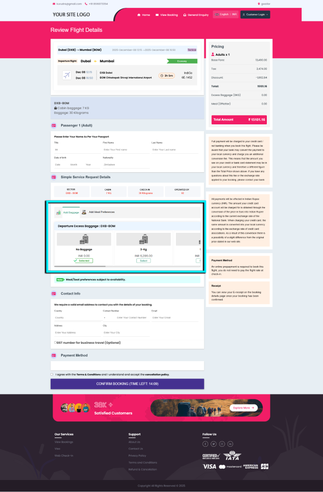Meals and Baggages (SSR) - B2C White Label Travel Portal