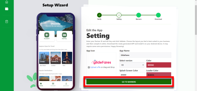 6. Upload your APP icon, select Theme and other configurable elements and click Go To Banners