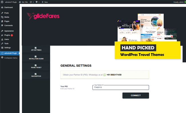 4. Click "glideFares Plugin" -> Enter your "(PID) Partner ID" and click "Connect"